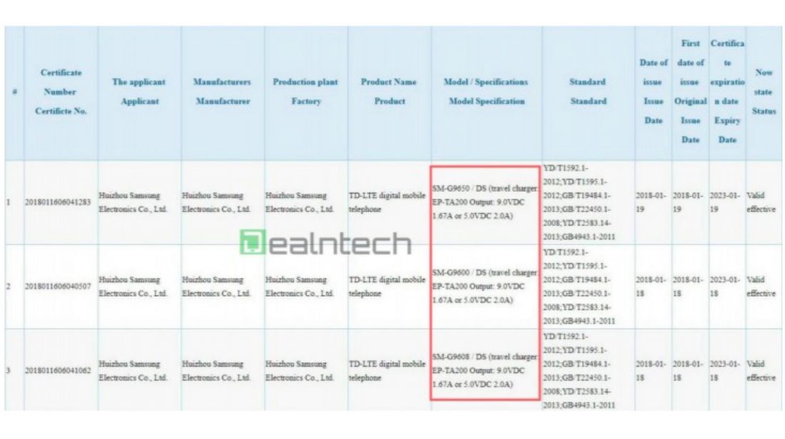 As predicted, it will be the same as on the current Galaxy S devices, this means up to 15W of power (9V @ 1.67A). The SM-G960x models are the Galaxy S9 and the SM-G965x is the Galaxy S9+. The “x” here represents the country, for example, 8 is Taiwan and 0 is China. This kind of 15W Adaptive Fast Charge has been present in Samsung flagship phones since the days of the Galaxy S6, so this doesn’t come as a surprise.