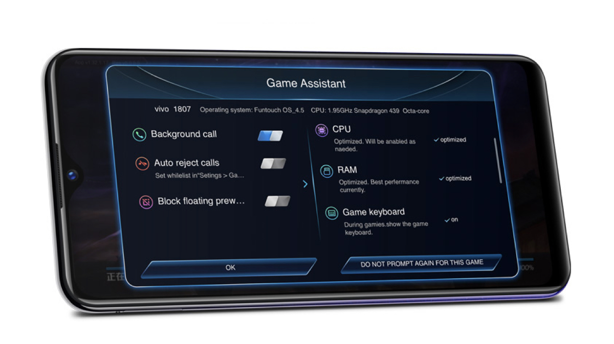 The rear camera setup comprises of an f/2.2 aperture equipped PDAF(Phase Detection Auto Focus) sensor and a 2 MP depth sensor. The Vivo Y95 can capture 1080p Full-HD videos at 30fps with both the front and rear cameras. The camera has multiple AI features like AR stickers, Auto-beauty and scene detection. It also has a dedicated AI Game mode which optimises the system for maximum performance. The AI game mode also has customisable of options like Auto reject calls and blocking app notifications.