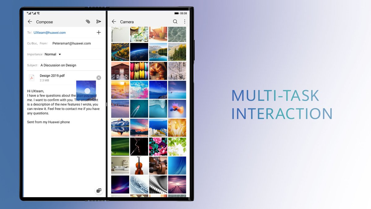 The Mate X is kitted with the Kirin 980 SoC which is manufactured using 7 nm fabrication process and is also featured on smartphones like the Mate 20 lineup and Honor View20. The chipset consists of an Octa-CPU and the Mali G76 GPU. The foldable Mate X is powered by dual batteries which have a combined capacity of 4500 mAh and are present in either halves of the handset. Noteworthy, it is the world’s first smartphone that can be charged with 55 watts of power. Furthermore, the 55 w charger shipped with the Mate X can also be used to charge other USB Type-C compatible devices including laptops. To safeguard both the device’s complex hinge mechanism and its screen against scratches, the company has also designed a case for it. Like the Galaxy Fold, it also supports multi task interaction which means the user can simultaneously run two or more application on the device.