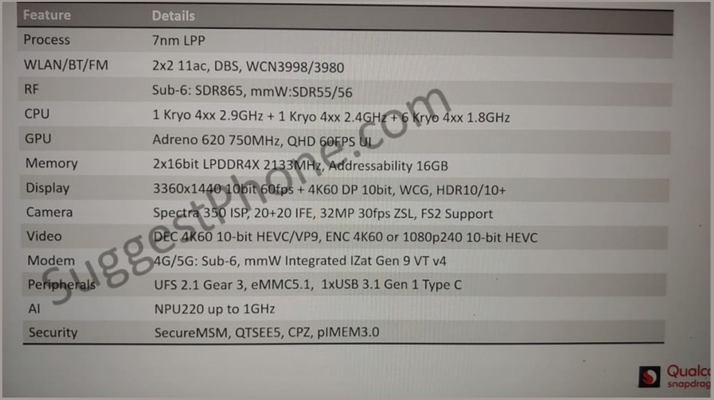 The Adreno 620 GPU is clocked at 750 MHz which is able to support QHD display panels which have a refresh rate of up to 60 FPS. In terms of storage, the chipset support UFS 2.1 Gear 3, eMMC 5.1 and USB 3.1 Type C. According to the listing, the Snapdragon 735 can support up to 16 GB of LPDDR4X RAM. Noteworthy, it consists of the NPU220 (Neural Processing Unit) which is clocked at a speed of 1 GHz. The NPU in the chipset will be used to execute AI tasks on the smartphone it is featured on. More details about the Snapdragon 735 are expected to follow soon as the company rolls information about it.