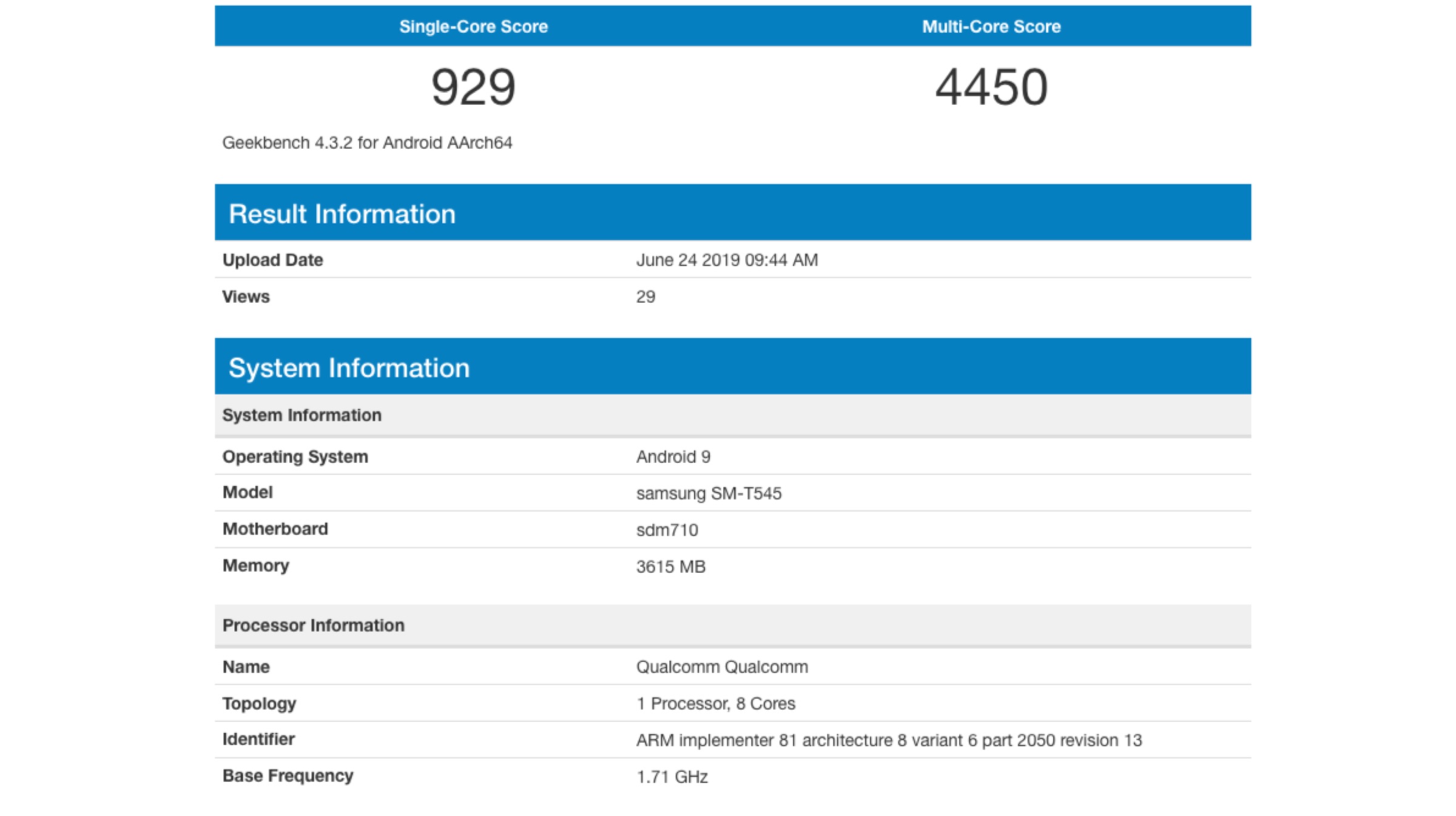 The Samsung tablet that has been leaked via the renowned performance benchmarking website Geekbench; is expected to be a slight upgrade to the Galaxy Tab S5e. The listing reveals the upcoming device will have the model number SM-T545, which coincides with the company’s tablet lineup. It will run on the 10nm Snapdragon 710 SoC which will make it the first tablet to feature the chipset. The processor is comprised of an Octa-core CPU and the Adreno 616 GPU. On the benchmarking tool, the device has been shown to have scored 929 in the single-core test; while the multicore test has yielded a result of 4450.