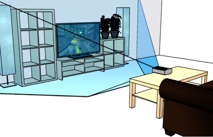 IllumiRoom is a wide-angle projector that’s situated on your coffee table, pointed at your big-screen TV. The current prototype has a Kinect strapped to the projector, but the final version will have a Kinect sensor built in. The built-in Kinect uses an automatic calibration process to captures the color and geometry (shape, depth) of the wall behind and furniture around your TV.