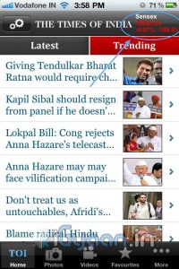 The app also shows a nifty live Sen-sex ticker in the top right corner and has a separate section for Photo galleries and Video news. The only feature we thought was lacking was a citizen journalist section to report news as it happens live around you. All in all this is a must have app for your device to keep yourself up to date with the changing world around you.