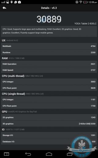 The tablet’s benchmark scores are quite impressive and translate into real time performance. Yoga Tablet 2 can handle everything thrown at it from 1080p flicks to graphic intensive games like Asphalt and Real Racing. Have a look at the benchmark scores below:
