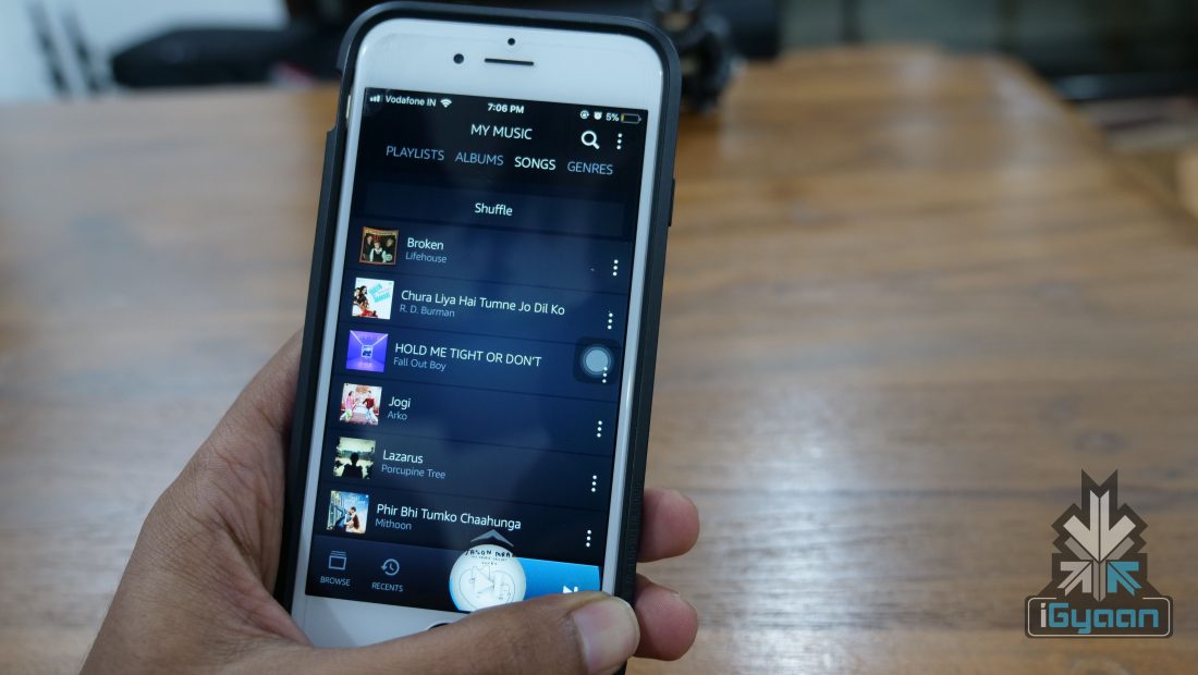The Prime Music app for iOS weighs in at about 65MB, which means people still using a 16GB iPhone should not have trouble installing this app. The Android version of the app comes with a similar weight. The app UI is pretty neat and simple. The dark theme is refreshing but, there isn’t an option to enable or disable it. The four toggles at the bottom help you navigate between offline music library, Alexa and recently search/played songs.
